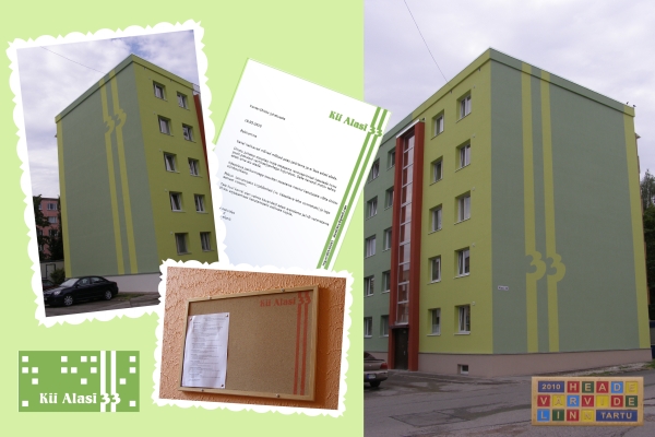 Sama motiivi kasutasime ka teadete tahvlil. Tartu linnalt saime 2010. aasta ilusaima renoveeritud kortermaja tunnustuse.
